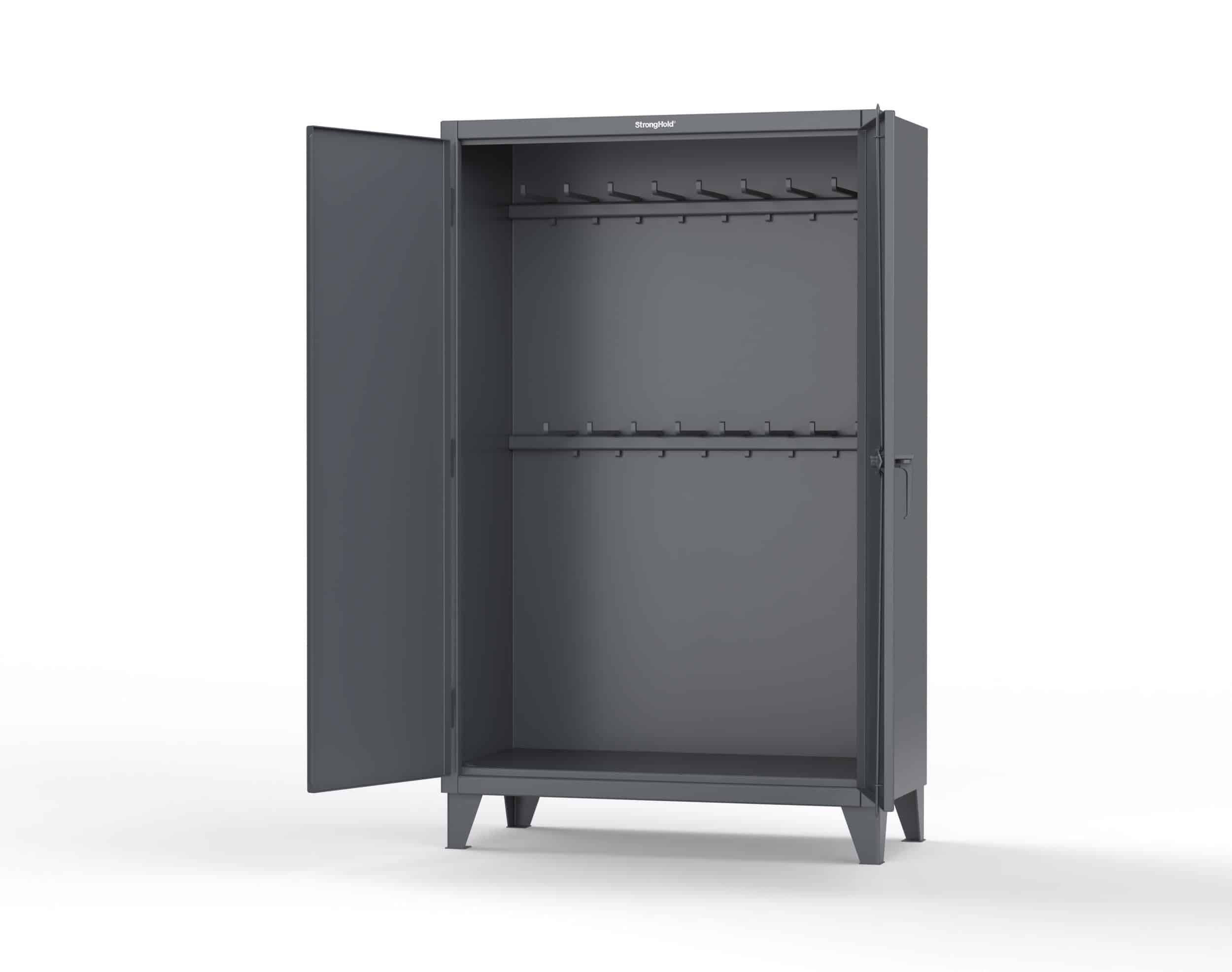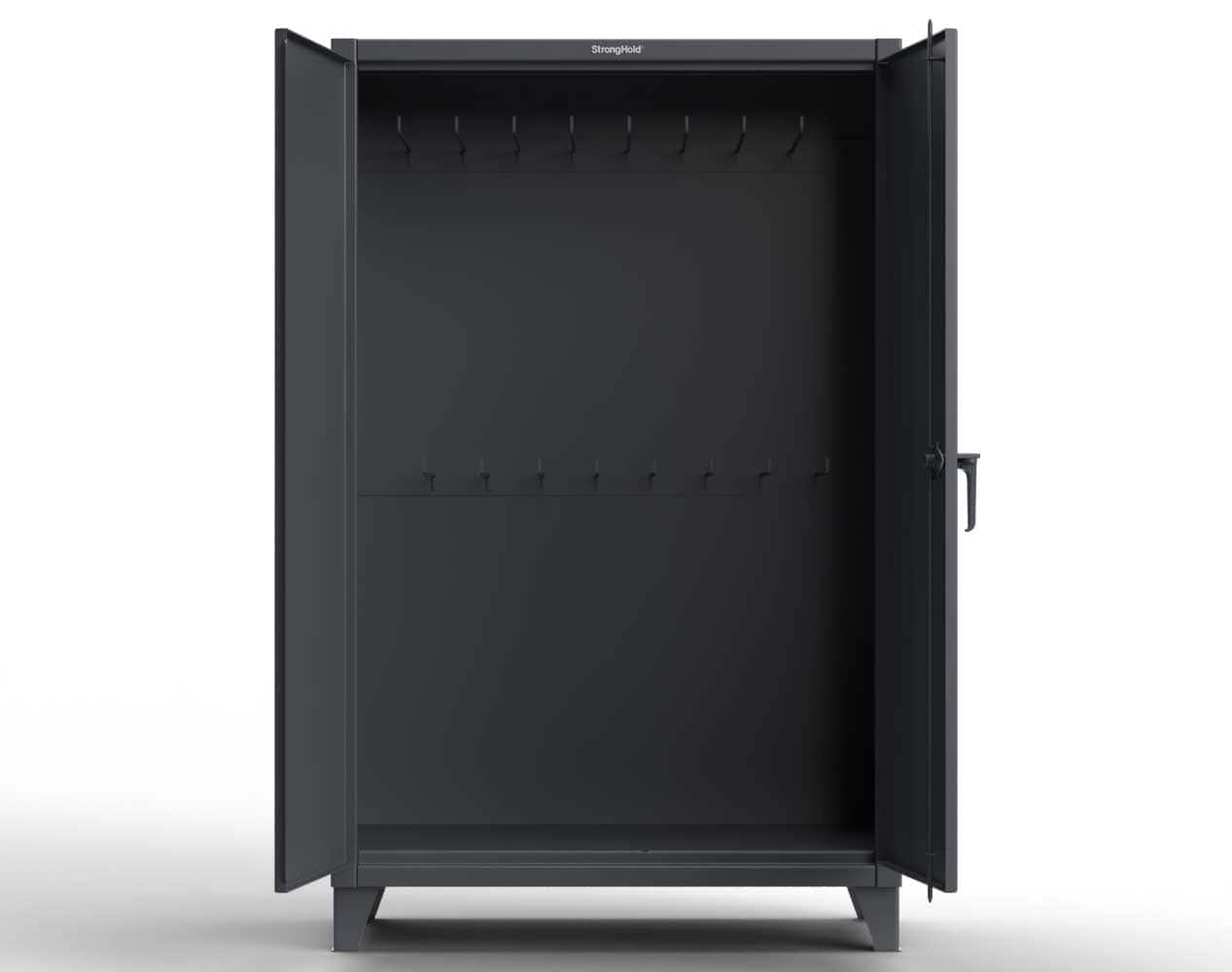 This heavy duty rigging cabinet is built from 12‑gauge, all‑welded steel, ensuring long‑term strength in demanding environments. It includes 16 welded hooks, creating a clean and simple rigging storage setup that works well for chains, straps, and hoist components. A 3‑point locking system accepts a padlock and supports OSHA‑compliant storage for rigging gear. The cabinet’s full‑height doors use 8‑gauge hinges with stainless‑steel hinge pins for smooth, long‑lasting performance. It arrives fully assembled, giving you a ready‑to‑use rigging storage solution without any installation.