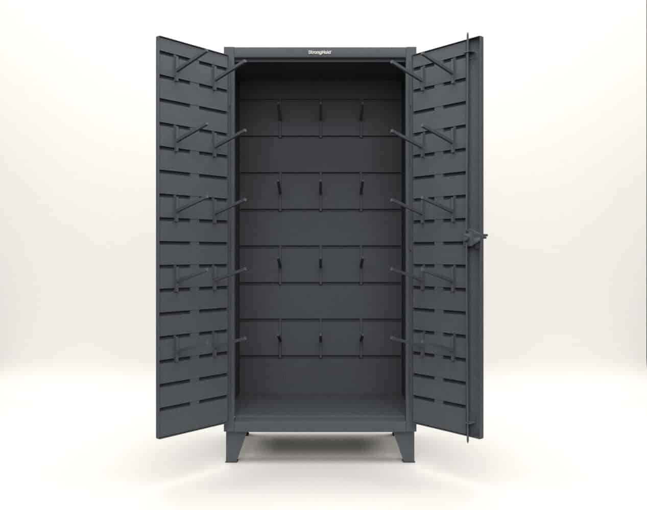 This heavy duty cabinet is built from 12‑gauge, all‑welded steel, providing strength that holds up exceptionally well in industrial settings. The inside features 28 adjustable hooks, allowing you to create a custom rigging storage layout that fits different chain lengths and tool types. A 3‑point locking system helps support OSHA‑compliant storage practices by securing your gear with a padlock. The full‑height solid doors operate smoothly thanks to 8‑gauge leaf hinges with stainless‑steel hinge pins, built for long‑term performance. The cabinet arrives fully assembled, letting you put it into service immediately as a strong, safe, and efficient rigging storage solution.