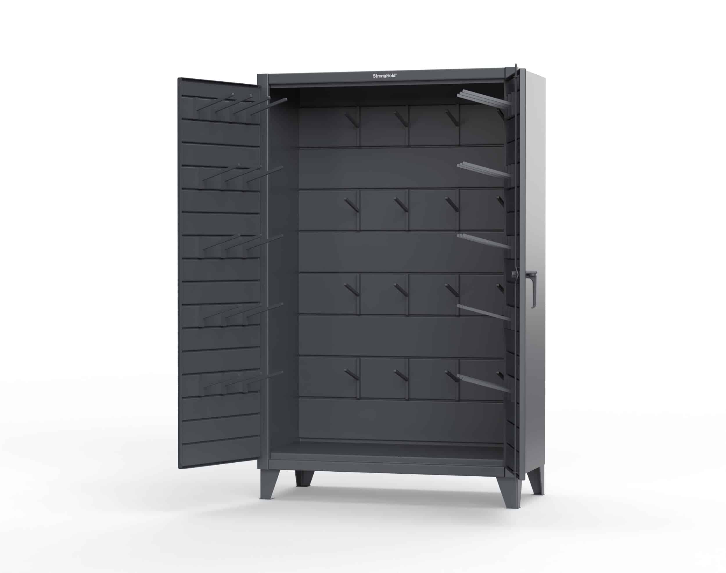 The Industrial Storage Cabinet for Rigging from Barron Equipment is a strong and reliable storage cabinet made by trusted brand Strong Hold. It is built from 12‑gauge welded steel, which makes it tough enough for heavy chains, slings, hoists, and other rigging tools. The cabinet includes 40 welded hooks, giving you plenty of room to hang and organize all types of rigging equipment.