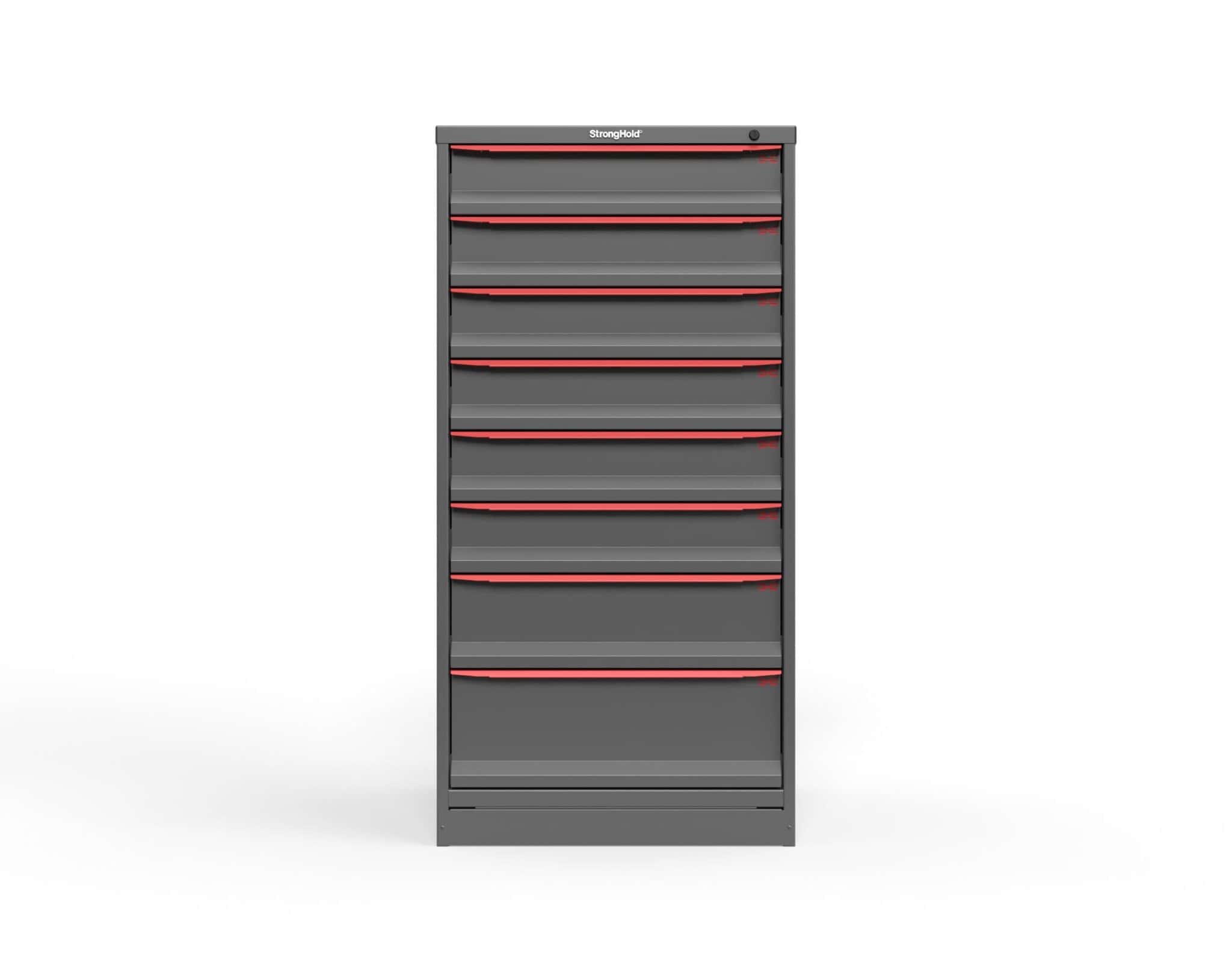 This cabinet is engineered for heavy-duty storage with its 14‑ga steel body and load‑bearing, full‑extension drawers. With eight drawers, six 5-inch, one 7-inch, and one 9-inch, it provides space for a wide variety of tools, components, and equipment. Each drawer holds up to 400 lbs, ensuring strength and stability during use.