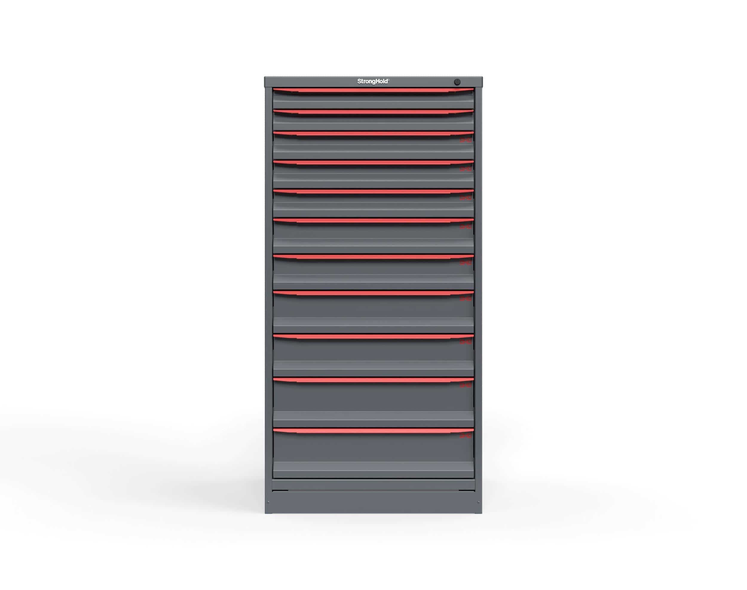 The S3060‑PPDAS‑1101 Modular Drawer Storage Cabinet is a durable, full‑height tool storage cabinet designed for industrial environments that require secure, organized, and long-lasting storage. Built from 14‑gauge all‑welded steel, this Strong Hold cabinet stands 60 inches tall and features 11 heavy duty drawers, each with a 400‑lb weight capacity. The cabinet includes a divider kit, uses a keyed lock for security, and sits on 3-inch integrated legs for easy pallet-jack or forklift access. It arrives fully assembled and is backed by 99‑year warranty.