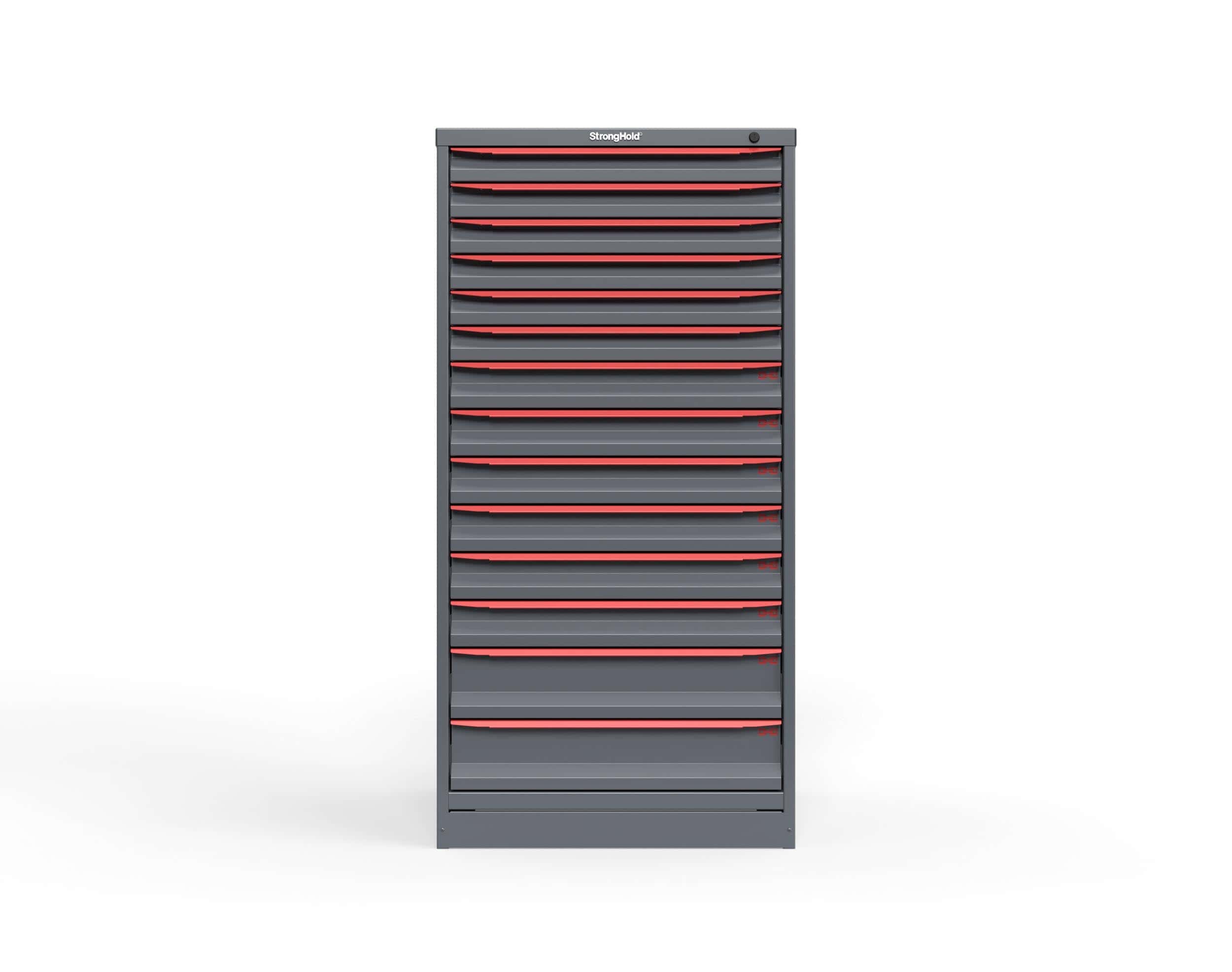This Strong Hold cabinet delivers dependable performance in demanding environments thanks to its 14‑ga steel construction and high‑capacity heavy duty drawers. With fourteen full‑extension cabinet drawers, it provides flexible tool storage for small parts, tools, hardware, and equipment that require structured organization.