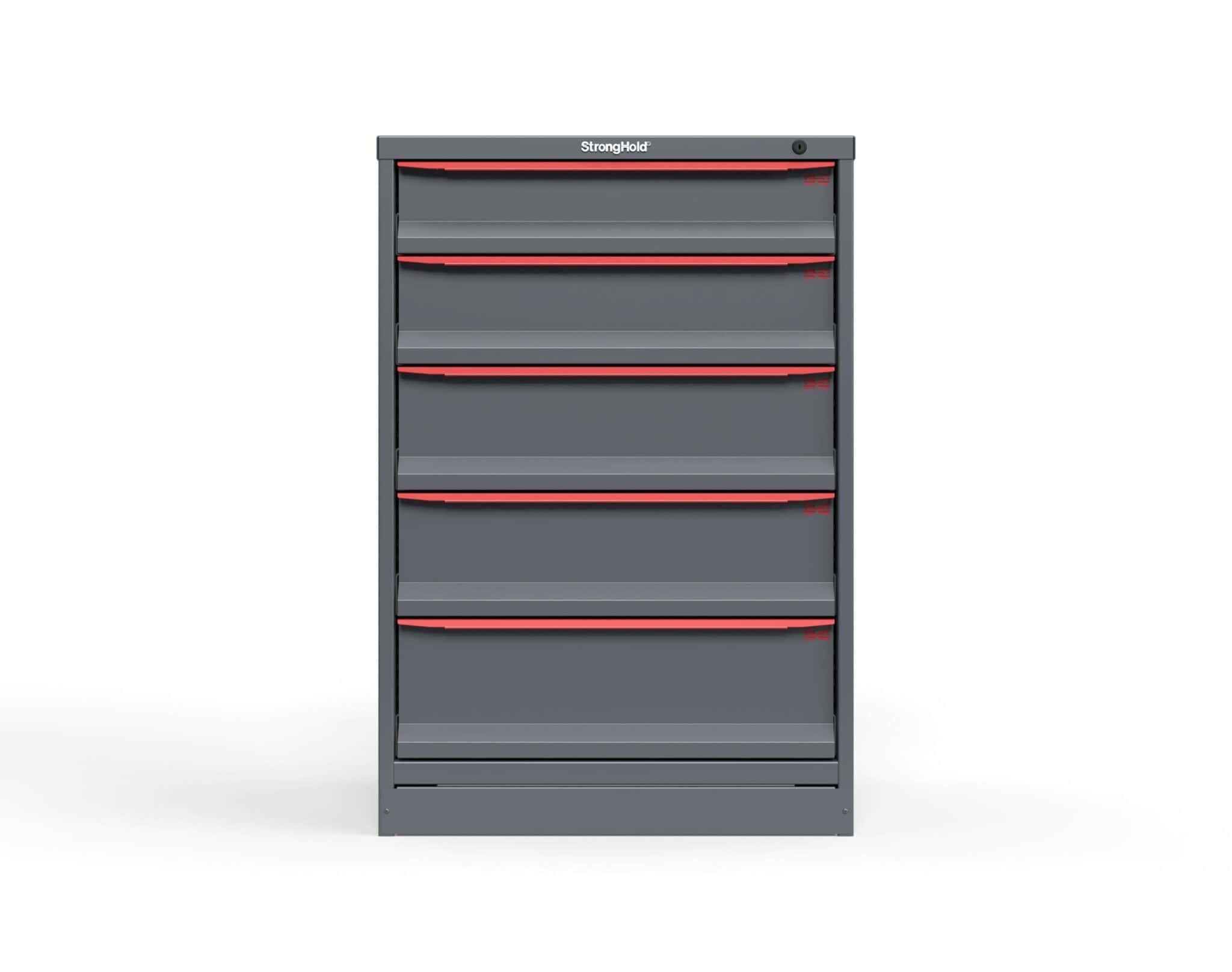 The Barron Equipment S3044-PPDAS-0502 Modular Drawer Storage Cabinet is designed for industrial-grade organization and durability. Featuring Strong Hold’s trusted construction, this tool storage cabinet is made from 14-gauge steel and offers five heavy duty storage drawers: one 5-inch drawer, one 6-inch drawer, two 7-inch drawers, and one 8-inch drawer, each with a 400 lb capacity. With a footprint of 30" W x 29" D x 44" H, it’s ideal for maximizing storage in compact spaces while providing secure, efficient access to your tools and supplies. Choose from red or light blue accent handles to match your workspace.