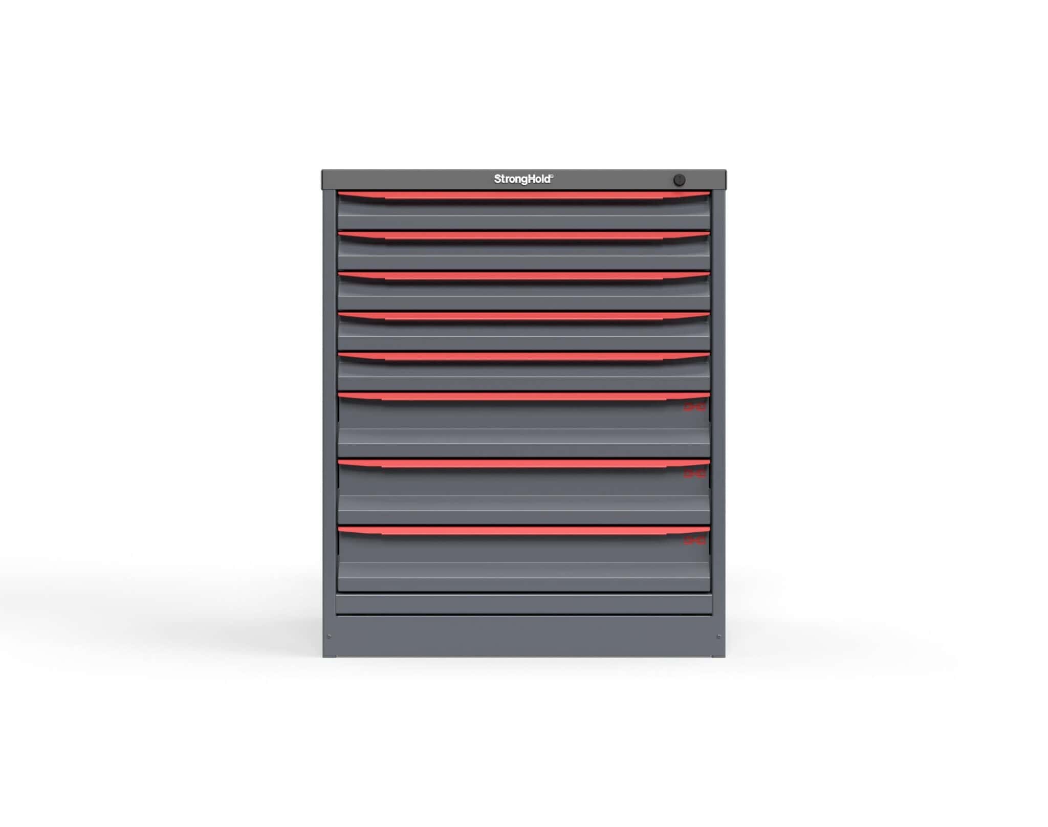 The Barron Equipment S3036-PPDAS-0802 Modular Drawer Storage Cabinet is designed for high-performance tool organization in industrial, commercial, and technical environments. Featuring Strong Hold’s renowned craftsmanship, this tool storage cabinet is constructed from 14-gauge steel and offers eight heavy duty storage drawers, each with a 400 lb capacity. With a compact footprint of 30" W x 29" D x 36" H, it maximizes storage efficiency while providing secure, easy access to tools and supplies. Choose from red or light blue accent handles to match your workspace aesthetic.Â