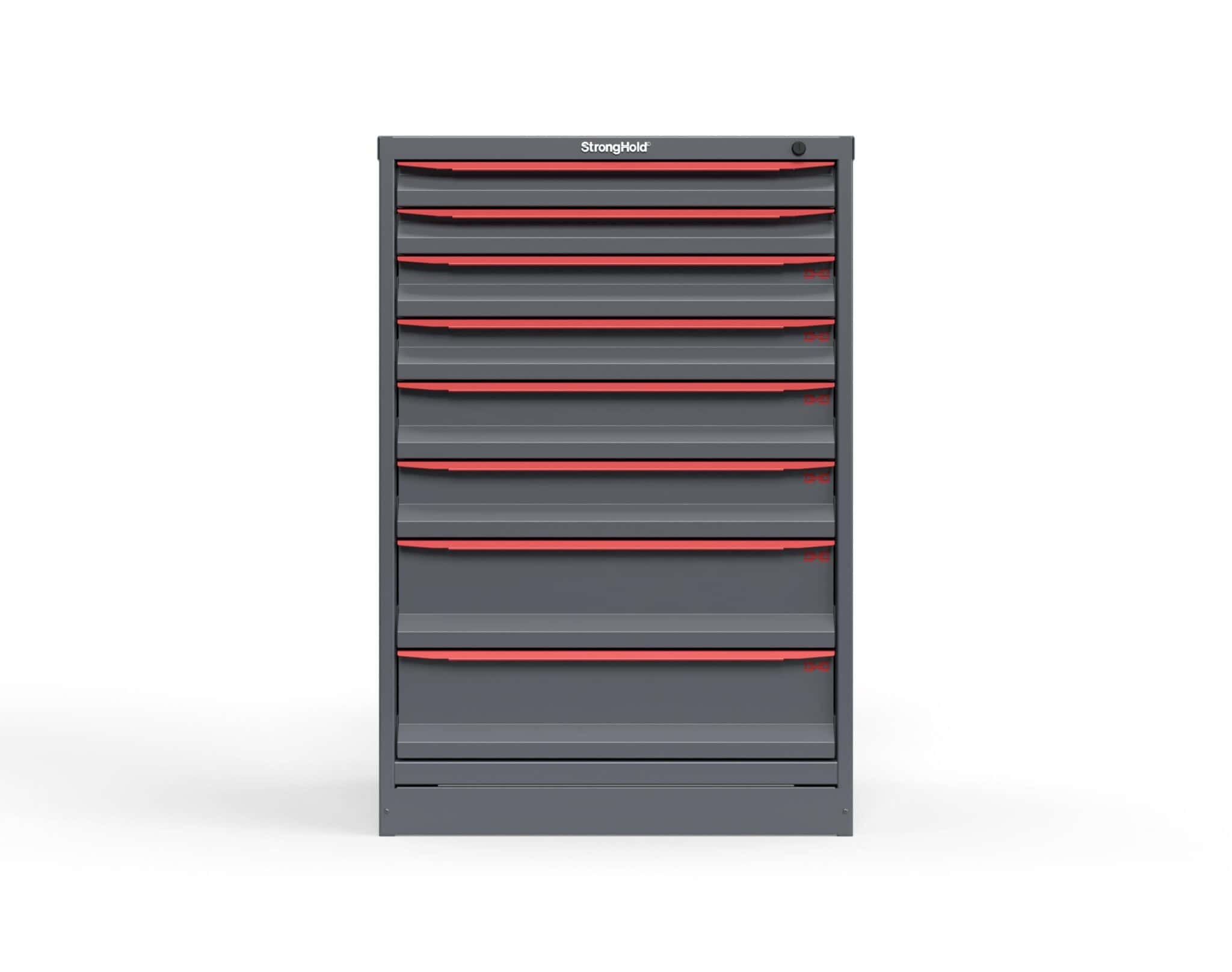 This cabinet is built for heavy duty work environments. Its steel body provides long‑term durability, and its eight drawers including two 2 inches, two 3 inches, two 4 inches, and two 6 inches. These heavy duty drawers offer a range of storage options for different sized tools and parts. Each drawer holds up to 400 lbs and includes dividers to keep items organized. The cabinet also features integrated 3" legs, allowing easy movement with a pallet jack or forklift. A keyed lock keeps tools secure, and steel handles provide added durability for everyday use.