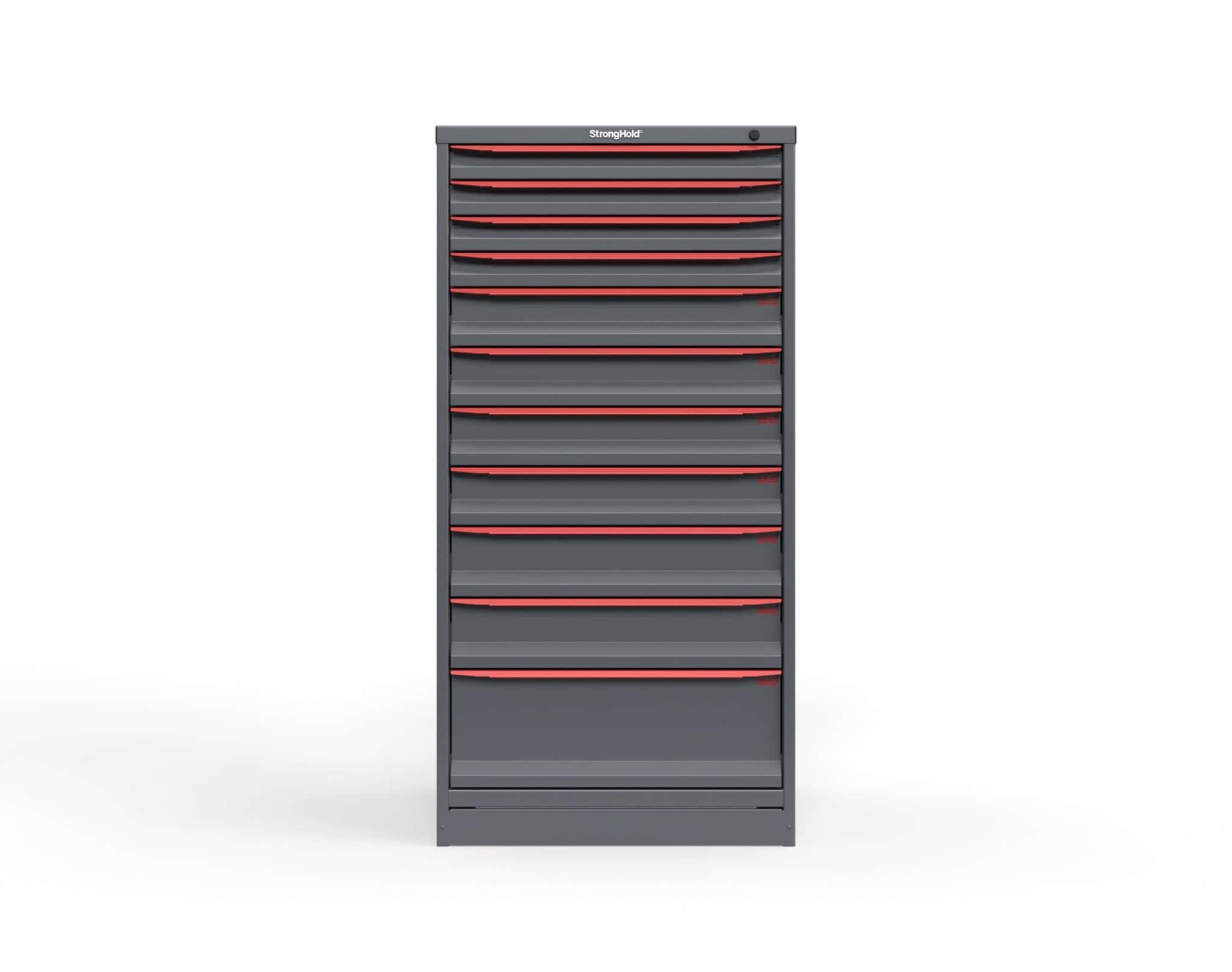 The S3060‑PPDAS‑1102 Modular Drawer Storage Cabinet is a full‑height tool storage cabinet designed for industrial environments that require secure, organized, and long‑lasting storage. Made from 14‑gauge all‑welded steel, this Strong Hold cabinet stands 60″ tall and includes 11 heavy duty drawers in a balanced mix of 3″, 5″, 6″, and 7″ depths. Each drawer supports 400 lbs, making it ideal for storing tools, components, and maintenance equipment. This cabinet ships fully assembled, includes a divider kit, features a keyed lock, and stands on 3-inch integrated legs for pallet‑jack or forklift mobility. Made in the USA and backed by a 99‑year warranty, it is built for long-term durability.