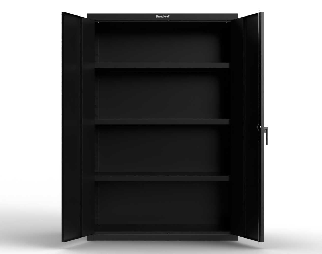 This heavy-duty welded storage cabinet from Barron Equipment is perfect for keeping storage visible and organized. This shelf storage cabinet has a 18 gauge cold rolled steel construction with a capacity of 4,000 lbs. The 3 adjustable, reinforced shelves make it easy to utilize every inch of heavy-duty storage space. Each shelf has a capacity of 1,000 lbs. The secure 3-point locking system on the locking cabinet keeps contents safe from theft or damage. This Stronghold cabinet comes fully assembled and is backed by a 10-year warranty.