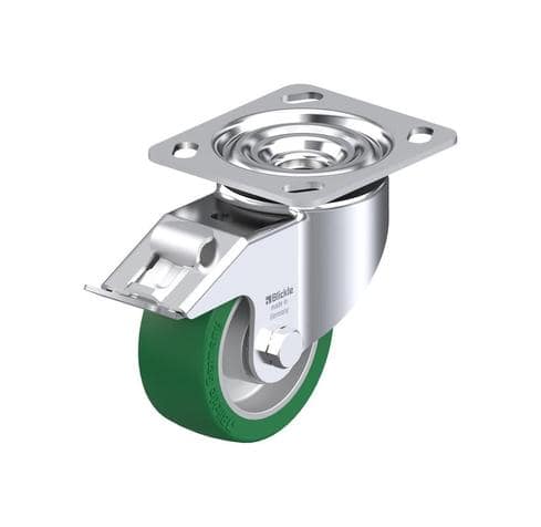 The Blickle LK-ALST 100K-14-FI is a heavy duty swivel caster designed for industrial applications. It features a robust brake system known as 'stop-fix' and is equipped with a heavy duty wheel that ensures reliable performance. The wheel is made with Blickle Softhane® polyurethane tread, which is cast onto an aluminum wheel center, providing excellent floor protection and durability.