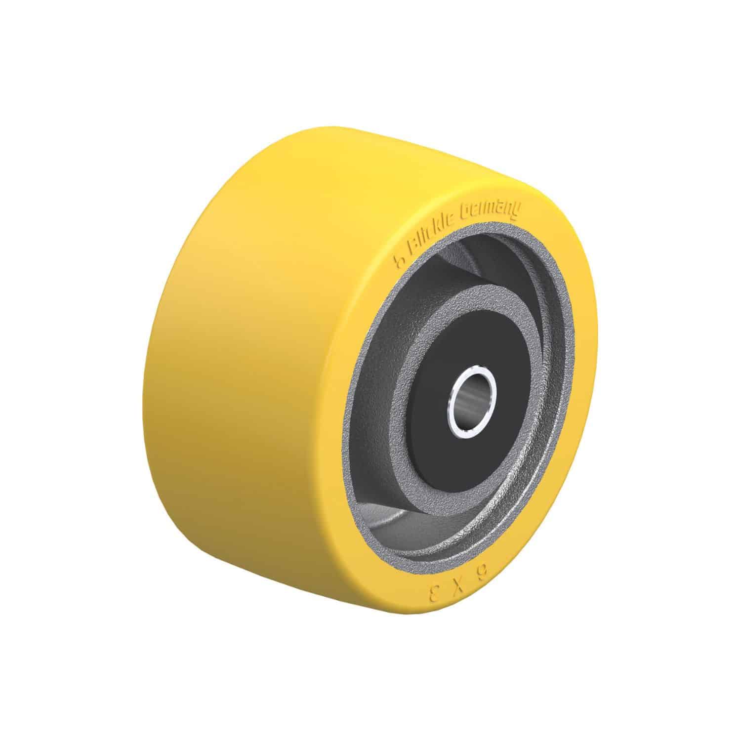 Blickle Extrathane® polyurethane wheels are built for heavy-duty performance, combining high load capacity with exceptional durability. These wheels feature a high-quality, reaction-injected polyurethane-elastomer tread that offers outstanding resistance to abrasion, cuts, and tear propagation—making them ideal for industrial environments with thresholds, sharp obstacles, and medium-speed transport.