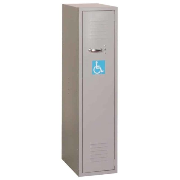 Width – 12 in. Depth – 81 in. Height – 48-5/8H in. Weight – 39 lbs. Our Lockers are constructed from 16-gauge steel with one-piece doors and 24-gauge body parts.Designed to meet all the ADA requirements for lockers. Includes handicap logo sticker.