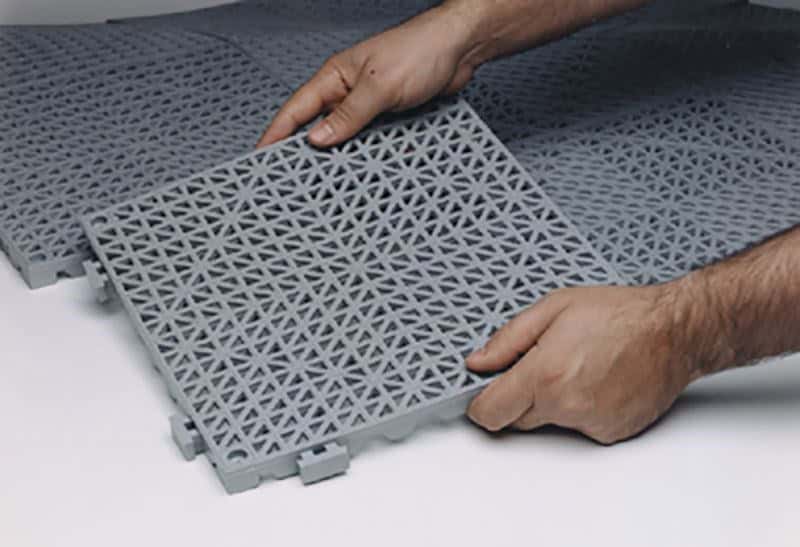 Recycled interlocking 12” x 12” tile is an excellent floor covering product and is ideal for compartment matting to protect drawers, trucks, and tools.