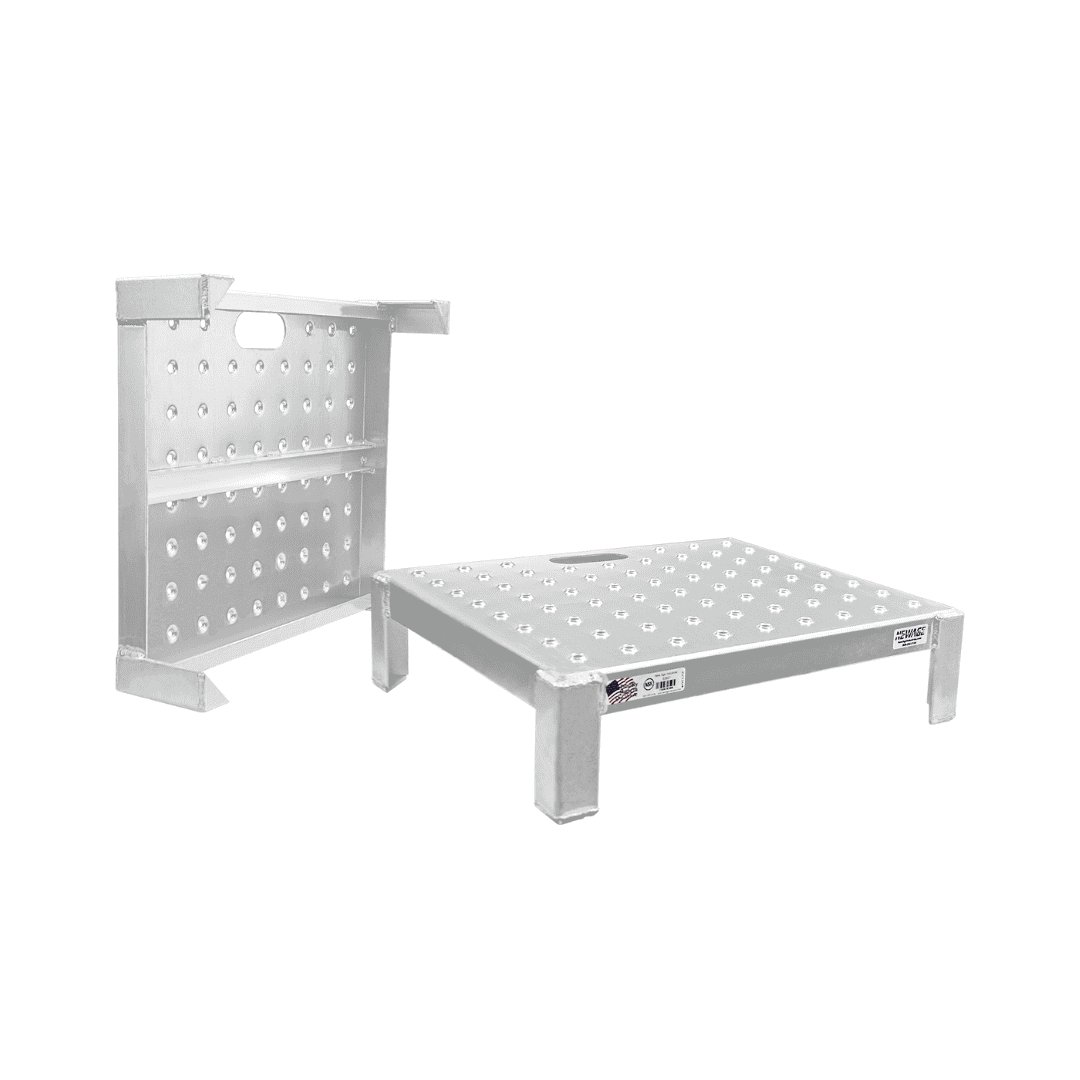 These heavy duty work platforms are constructed from rust‑resistant aluminum, keeping the stand lightweight while still offering long‑term strength. The deck is made from 0.125-inch aluminum sheet, engineered with a slip‑resistant surface to keep footing secure during elevated work. A reinforced base and 0.188-inch aluminum legs ensure structural stability under daily use.