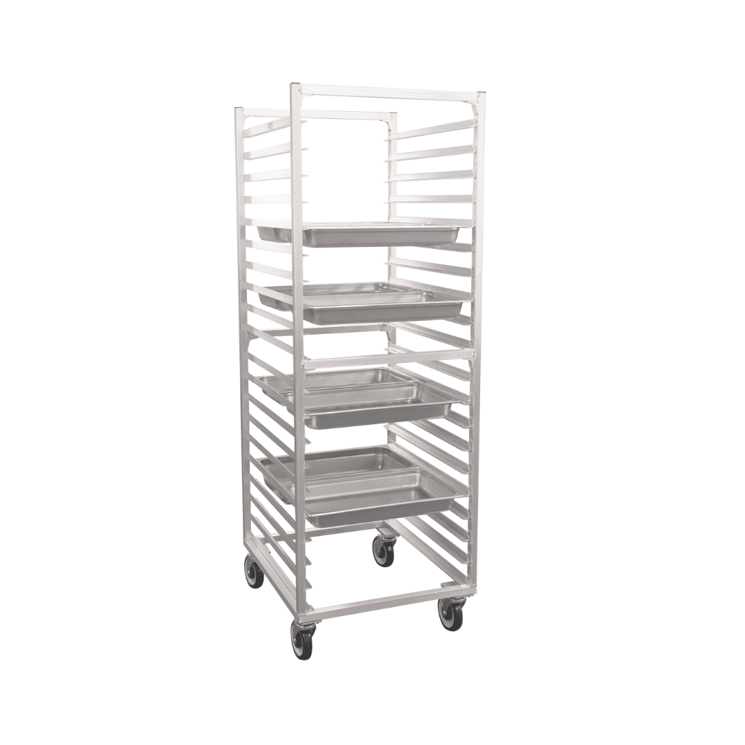This heavy‑duty rack is engineered for long‑term performance. The frame uses aluminum tubing for strength and stability, while the fully welded guides provide a durable structure without cracks or crevices where debris can collect. Extra gussets are added in every corner for increased rigidity, supporting full‑sized hotel pans and steam table pans with confidence.