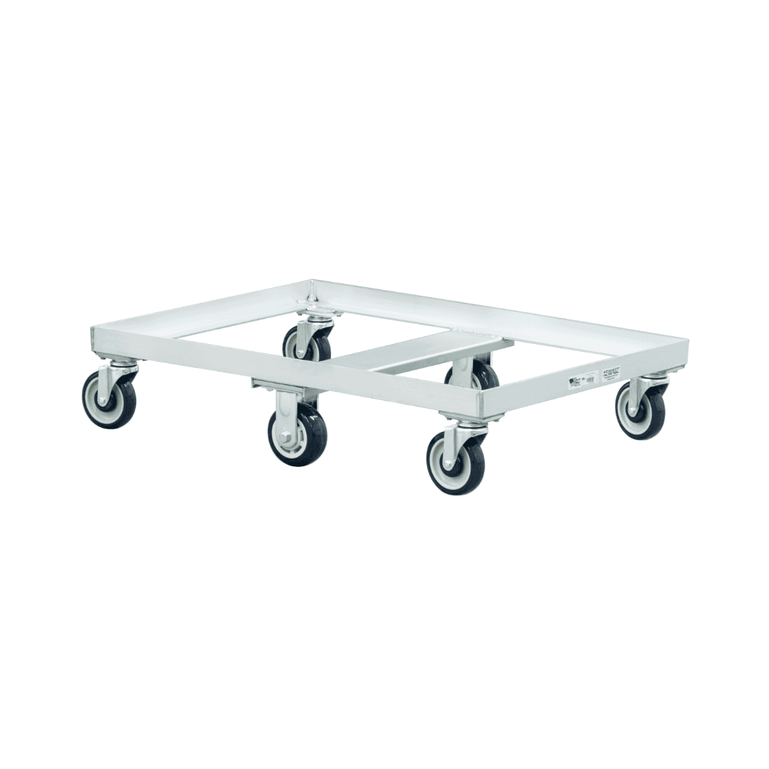 This tote dolly is engineered with a rugged heavy‑wall aluminum frame that balances long‑lasting durability with a lightweight structure that’s easy to use. The six‑caster, zero‑turning‑radius design allows the dolly to move smoothly around tight corners, narrow aisles, and crowded production areas. This layout reduces the effort needed to change direction and makes the dolly highly maneuverable even when fully loaded with dolly tubs.