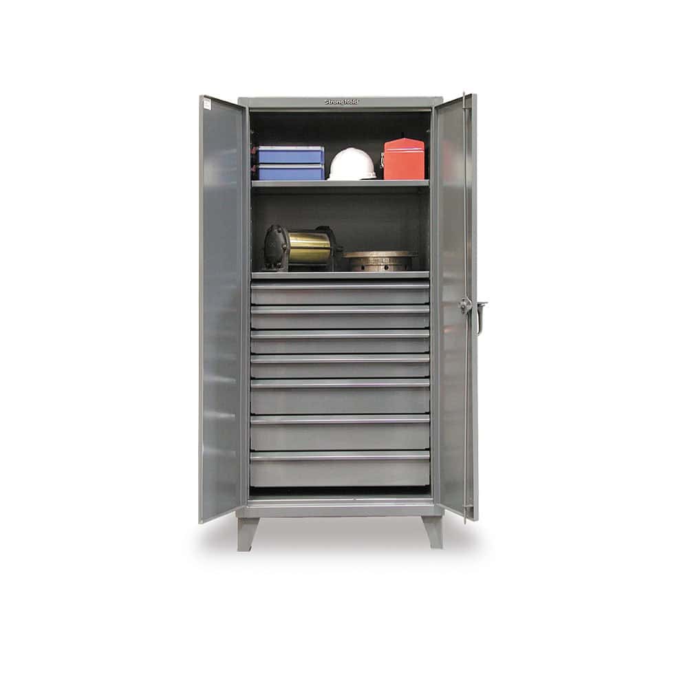 Heavy duty 12 gauge cabinet with 7 drawers. Includes 14 gauge shelves that can be adjusted in 2 inch increments. 3-point locking device can be locked with a standard padlock.