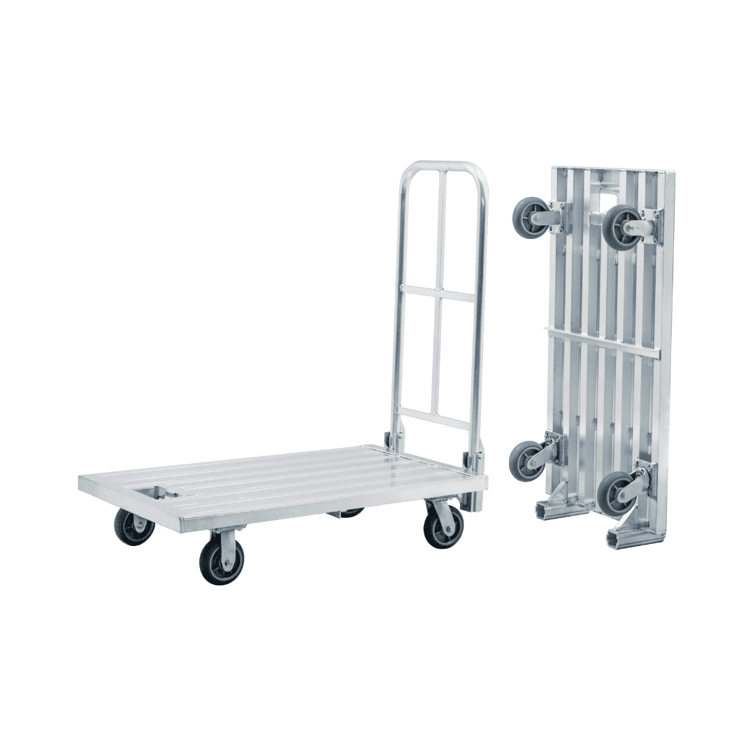 This flatbed cart is built from lightweight but strong aluminum, offering the durability needed for daily industrial use. The folding handle allows the unit to collapse when not in use, saving valuable storage space and perfect for tight areas or vehicles. The platform’s smooth surface supports heavy loads without bending, turning this unit into a dependable platform dolly for various tasks.