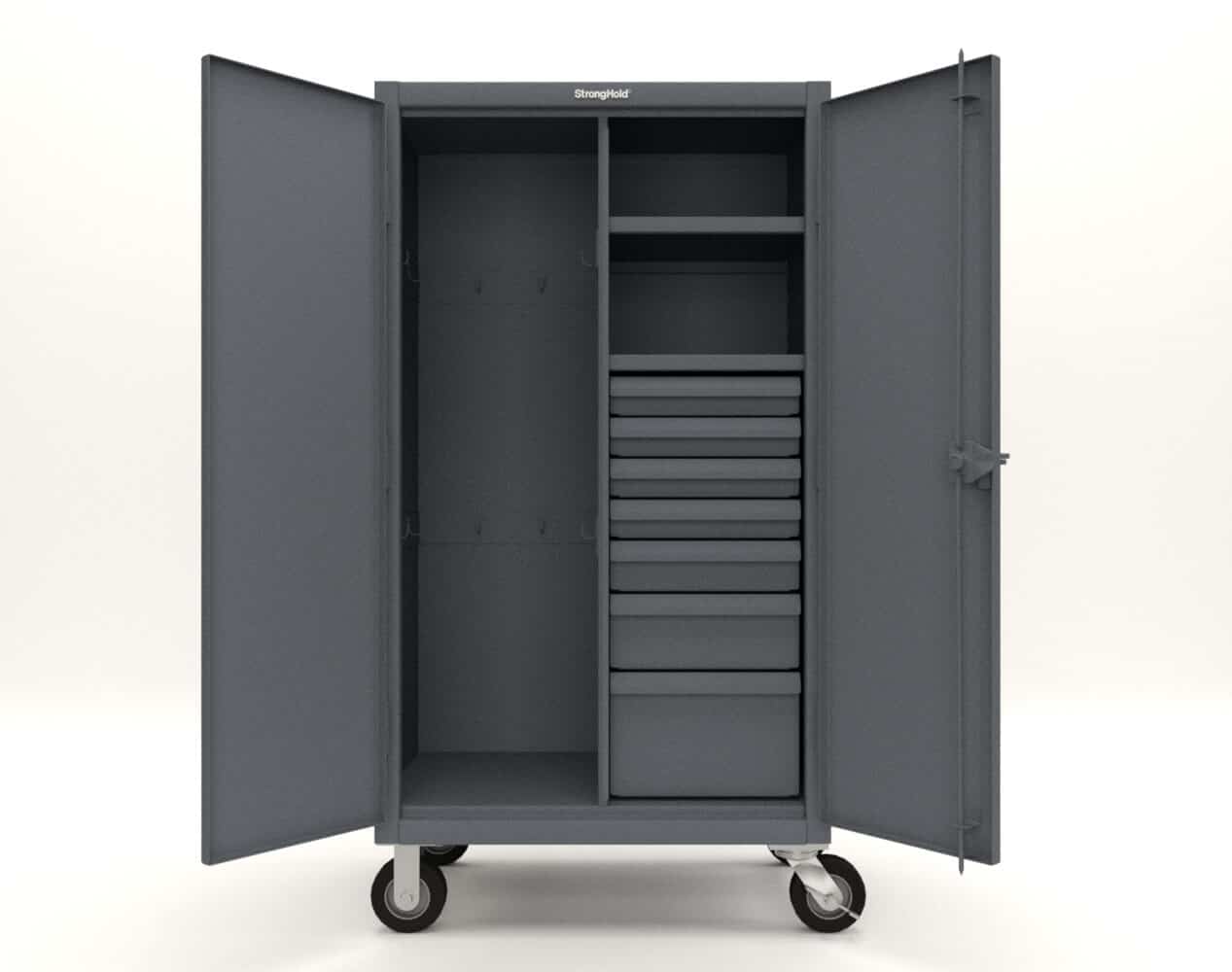 The Industrial Mobile Rigging Cabinet from Barron Equipment—built by trusted brand Strong Hold—is a durable rigging cabinet designed for organized storage and easy movement around busy work areas. Made from 12‑gauge all‑welded steel, the cabinet includes 7 heavy‑duty drawers and 2 adjustable shelves. The shelves can hold up to 950 lbs each, while the drawers support 400 lbs each, giving you a strong and reliable chain storage and tool‑storage setup. With heavy‑duty casters, this unit is easy to move across job sites or shop floors.