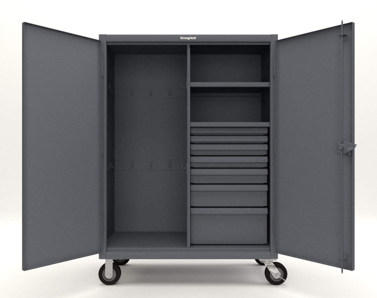 Move your larger tools and organize your smaller tools in this mobile indoor job box. Unit comes with 7 drawers, 2 adjustable shelves and 16 hooks. Manufactured from 12 gauge steel, this job storage cabinet is built to last.