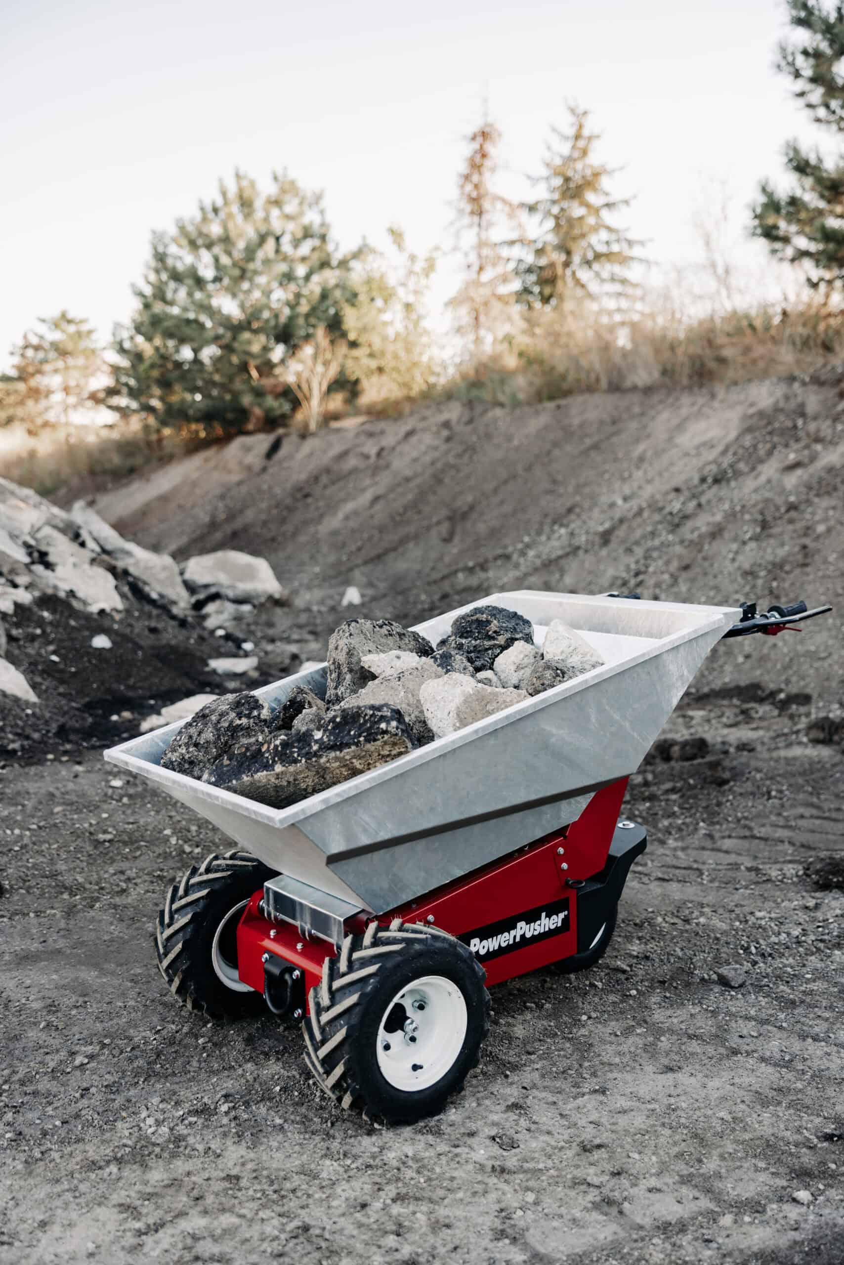 The PowerPusher E-750 Electric Wheelbarrow™ safely and easily transports loads weighing up to 1,000 pounds. Available with a galvanized steel tub or heavy-duty, high-density poly tub, this motorized electric wheelbarrow improves safety and efficiency by eliminating ergonomic challenges and unnecessary production delays that are associated with manually operated wheelbarrows.