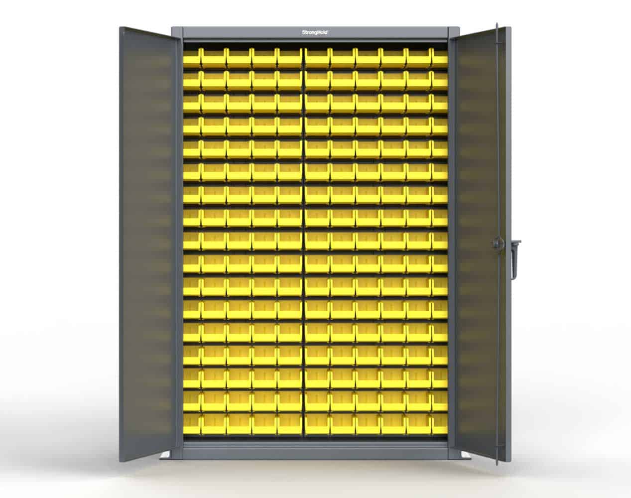The yellow bins are constructed of polypropylene and have a hopper front with a label holder. They can be removed for easier part selection and restocking. We offer a variety of bin cabinets. We recommend these cabinets be anchored to your floor or wall.