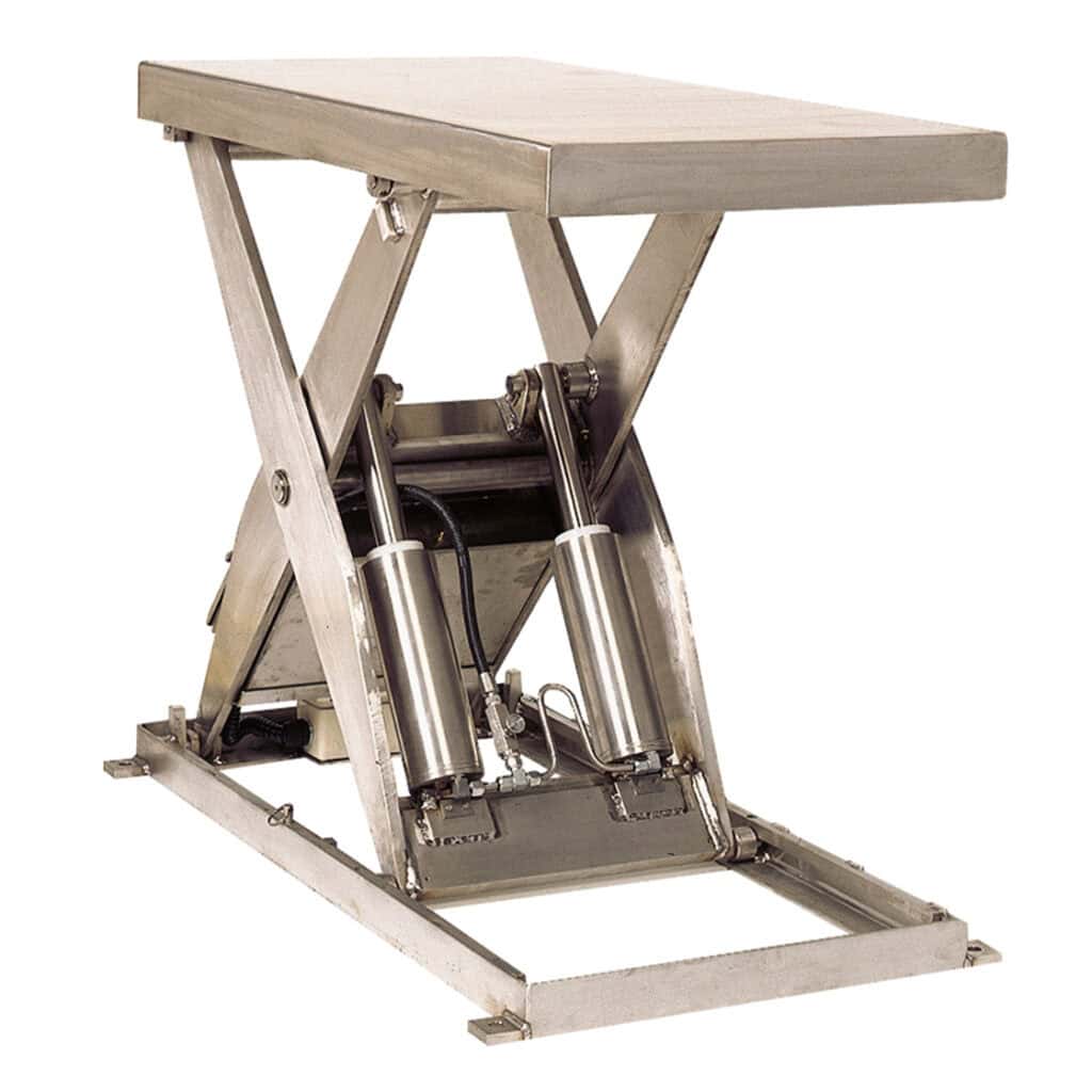 Each liftable table is made with steel and stainless components to resist rust and wear. The cylinders feature USDA-approved finishes, and the platforms are available in sizes up to 48” x 72”. These hydraulic lift tables come in models with load capacities of 2,000 or 4,400 pounds.