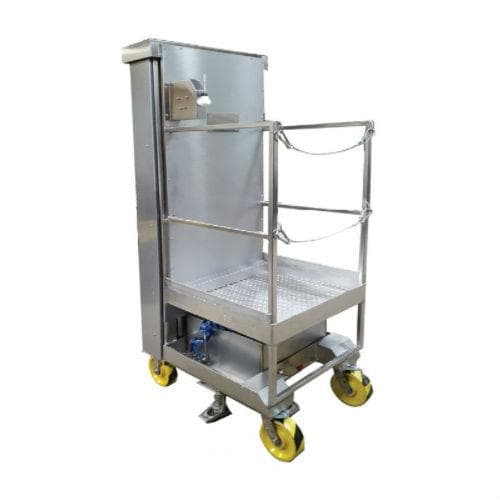 Stainless Steel Manlifts are used in clean rooms and ready to eat areas where cleanliness is demanded. They are available in 304 and 316 stainless steel and have lift heights up to 120 inches. Perfect for any overhead work, the Stainless Steel Superlift Air Powered manlift was designed specifically for EX rooms where dust and or vapor are in the air. This manlift has a very small footprint for maneuvering around equipment in tight areas. The mast is lined with brass to eliminate any chance of static and or sparking of metal, non static casters and mast wheels ensure this is completely Explosion proof. Stable at the full raised height covers of all major components for an easy wipe or wash down, the Superlift Air Powered Manlift will ensure operator safety and security so they can work effectively at a high height.