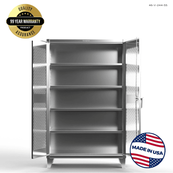 The commercial stainless-steel storage cabinet comes fully assembled and the company backs it with a 99-year warranty. The Strong Hold Extreme-Duty Stainless Steel Cabinet ships quickly and is made in the USA.