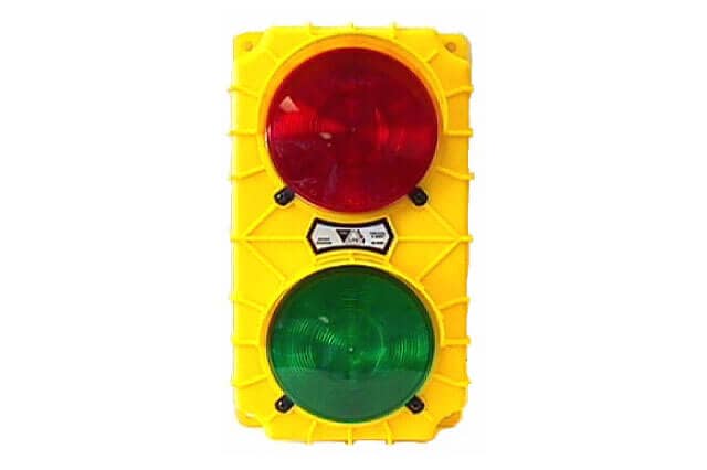 The Stop-Go Loading Dock Safety Light with Switch and Flasher (SG20) consists of a housing and two lamps designed for use beside the loading dock door on the inside of the building. Three leads exit the back of the light; a common shared by both lights, a hot for the red lamp and a hot for the green lamp (115 VAC also have a ground.) It includes a three way toggle switch on the bottom of the housing. Flip the switch one way and the green light comes on; flip it the other way and the red light illuminates. The center position turns the light off. The SG20 also has a flasher built into the unit. Electrical installation consists of two power leads (plus a ground for 115 VAC.)