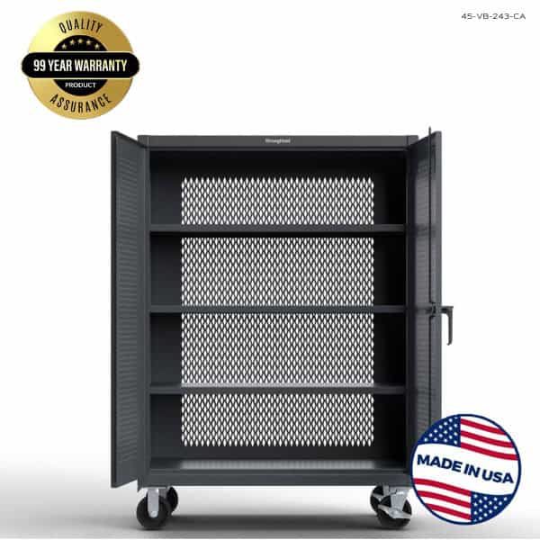 This fully mobile cabinet with ventilation has an overall capacity of 4,800 lbs with 3 adjustable shelves that can adjust in 2 inch increments and are made of reinforced steel. Each shelf in the heavy duty storage cabinet can hold up to 1,500 lbs. This makes it easy to utilize all the available space.