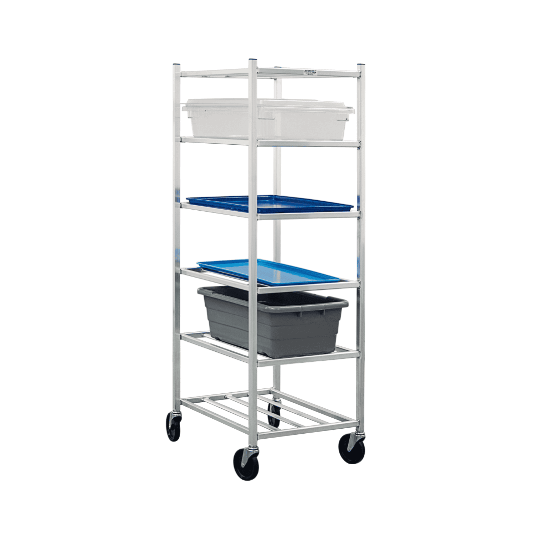 Barron Commercial Shelf Cart is a durable and adaptable shelf cart designed to support busy material handling and kitchen environments. Built from welded aluminum, this rolling shelf cart is lightweight, corrosion‑resistant, and easy to maneuver. With six runners spaced to accept trays, pans, or bins, it provides an efficient way to transport and organize items in commercial operations such as restaurants, production facilities, and storage areas.